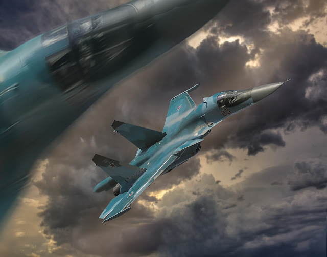 ... this is a recent photo-illustration project I completed. One of the fun things about these projects is being able to create situations and 'documenting' images that have never been seen before. In the early 1950's, there was a window of opportunity, when very high altitude reconnaissance flights by 'Peacemakers' over the Soviet Union were possible. 'Featherweight' B-36's [stripped of all guns except for the tail cannon] were able to attain altitudes of 53,000 feet! At that height triple A, SAM's and even Mig-15 fighters could not harm them. Here we see a pair of Migs skidding past the big bomber in a failing attempt to maneuver in the thin, thin air. If they dare to fire off their guns it will cause a stall and spin to a lower altitude.